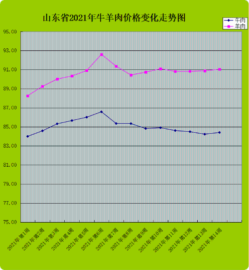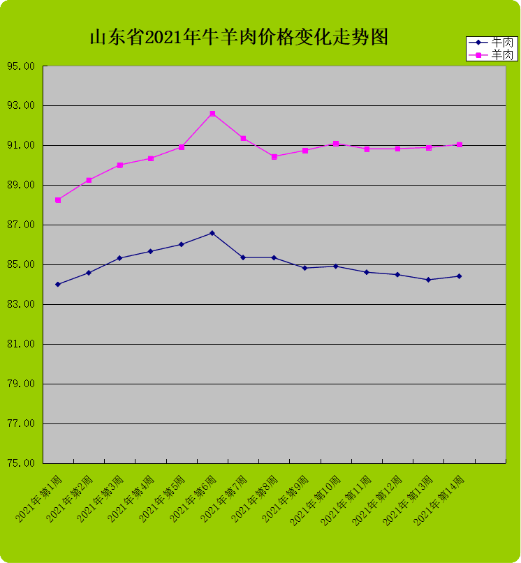 第14周,我省牛肉和羊肉价格高位向上,双双走高,涨幅收窄。截至第14周末,牛肉价格为84.40元/公斤,同比升高8.11%,环比回升0.21%;羊肉价格为91.03元/公斤,同比升高8.85%,环比回升0.17%。