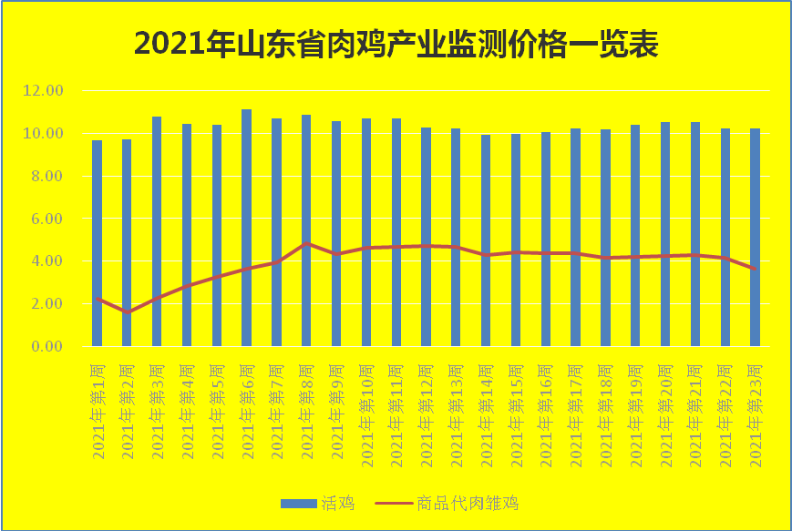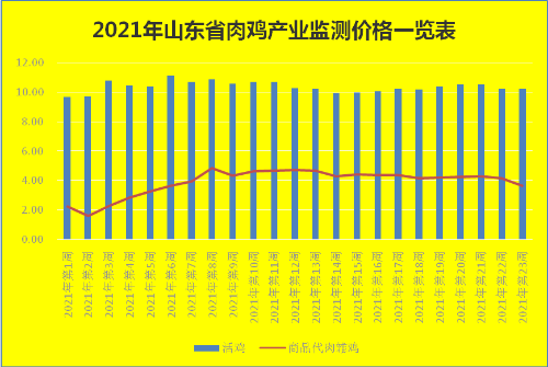 第22-23周,受猪价下行影响,肉鸡价格亦承压回落,短期未走出行情低谷期。截止第23周,活鸡价格为10.23元/公斤,同比升高20.35%,环比降低0.29%。其中最高地区潍坊安丘价格为18.00元/公斤,最低区域在莘县为8.10元/公斤。