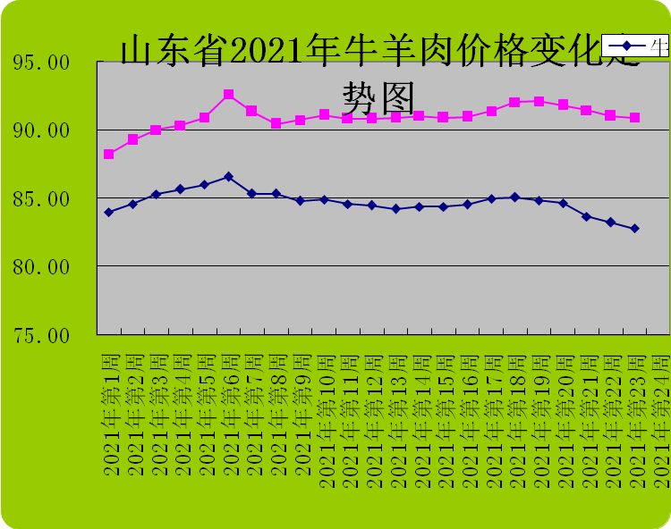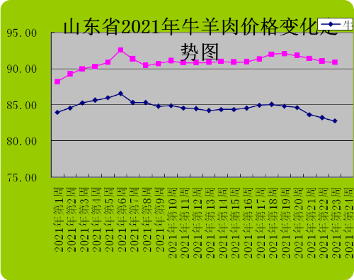 第22-23周,我省牛肉和羊肉价格持续小幅回落,下行探底。截至第23周末,牛肉价格为82.80元/公斤,同比升高7.13%,环比回落0.52%;羊肉价格为90.90元/公斤,同比升高10.54%,环比降低0.13%。