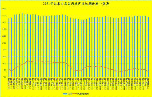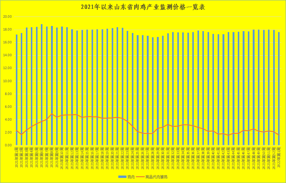 第1周,本周商品代肉雏鸡和鸡肉价格弱势回落,向下走低。截至第1周末,我省肉雏鸡均价为1.57元/羽,同比降低31.14%,环比回落24.15%,其中最高价地区是济宁邹城市为2.70元/羽,最低区域价格在聊城莘县为0.80元/羽。