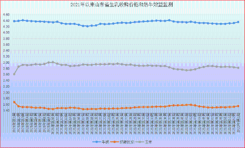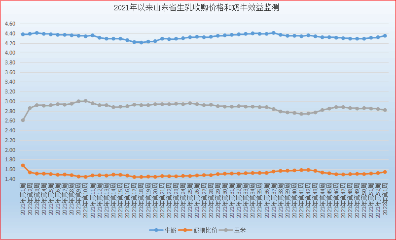 第1周(1月3日-1月9日),生乳价格本周持续上行。截至第1周末我省生乳为4.35元/公斤,同比降低0.68%,环比升高0.69%。在我省监测的26个县中,剔除三个无效数据,有12个县的价格大于或等于全省平均价格,其中最高价格在临沂郯城县,为4.70元/公斤;最低价格出现在潍坊青州市为3.95元/公斤,最高价与最低价差值为0.75元/公斤,差价与上周相比收缩。本周奶粮比价为1.54:1,同比回落8.33%,环比回升1.32%。