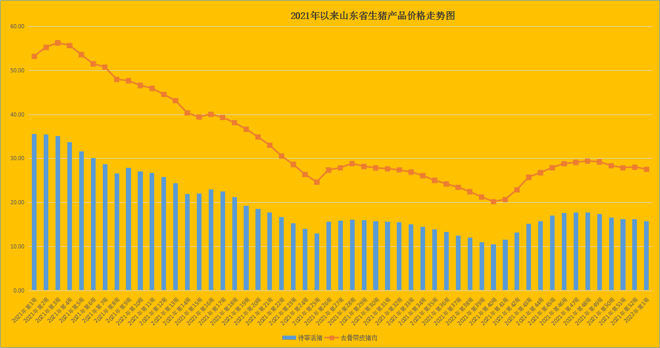 2022年第1周(1月3日-1月9日),生猪市场一反常态,全面回落。我省生猪价格企稳后再次回落,猪肉价格下行,仔猪价格连续四周走低。据对全省26个集贸市场价格定点监测,第1周末全省生猪出栏均价为15.81元/公斤,同比降低55.63%,环比回落2.77%。元旦过后猪肉消费需求回落,猪肉价格回落。据省畜牧总站监测,上周猪肉市场交易量环比降低2.66%,截至第1周猪肉均价为27.55元/公斤,同比降低48.22%,环比回落1.75%。生猪配合料价格与上周持平,为3.54元/公斤。