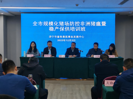 12月3日,济宁市畜牧兽医事业发展中心在汶上成功举办全市规模化猪场防控非洲猪瘟暨稳产保供培训班。来自全市各县市区畜牧中心生产分管领导、部分乡镇兽医站站长及部分规模化猪场的负责人和技术人员共110余人参加了本次培训。