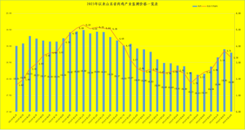 第33周,受消费恢复不及预期影响,鸡肉价格小幅回落。本周,鸡肉市场销售均价为18.80元/公斤,同比降低5.29%,环比降低0.58%。