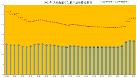 第33周(8月14日-8月20日),本周生猪价格震荡下调,猪肉价格向上增长,但涨幅与上周相比有所收窄。据对全省26个集贸市场价格定点监测,第33周全省肥猪出栏均价为17.39元/公斤,同比降低17.23%,环比回落0.97%。猪肉价格小幅走高,本周猪肉均价为28.43元/公斤,同比降低23.47%,环比回升1.17%。