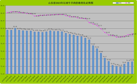 第33周,我省牛羊肉周平均价格继续小幅回升。据监测,本周我省牛肉市场交易量同比降低4.92%,环比回升0.23%;羊肉市场交易量同比降低2.00%,环比回升0.42%。第33周,我省牛肉均价为73.23元/公斤,同比降低9.73%,环比升高0.11%;羊肉价格为80.55元/公斤,同比降低5.85%,环比升高0.25%。