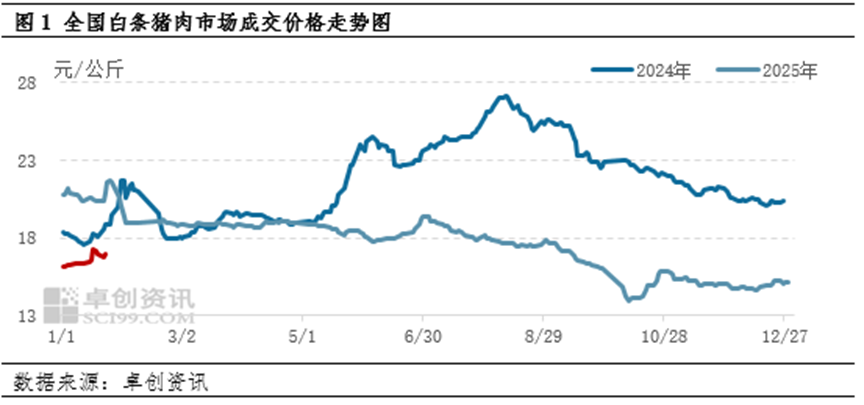 由于母猪产能去化,生猪及猪肉供应减少,2025年四季度以来白条猪肉价格震荡走高,且一直持续至2026年1月份。展望2月份猪肉市场,基本面供需双减的背景下,2月份白条猪肉价格或先涨后跌,均价环比上涨。 2025年白条猪肉价格在10月份触及低点后开启反弹,虽然11月呈现缓跌状态,但12月中下旬猪肉价格强势走高,反弹走势延续至2026年1月份。根据卓创资讯数据监测,截止到2026年1月26日,1月全国白条猪肉市场月度平均成交价为16.56元/公斤,较2025年12月份上涨。